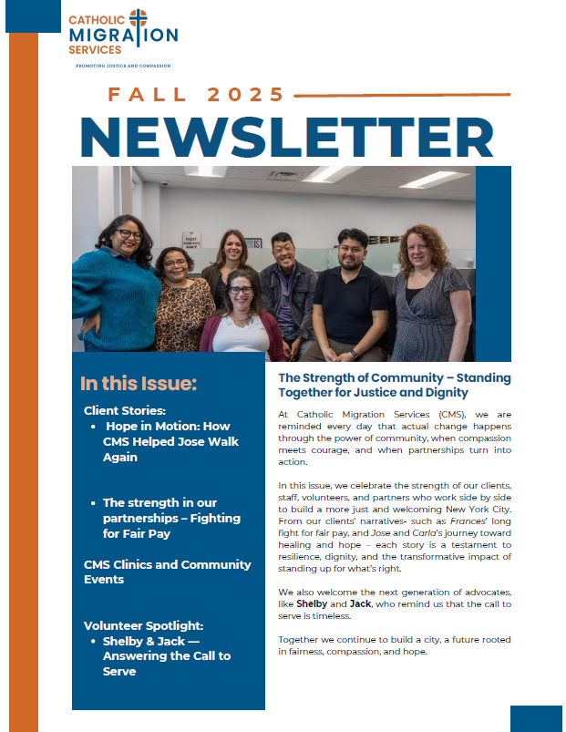 At Catholic Migration Services (CMS), we are reminded every day that actual change happens through the power of community, when compassion meets courage, and when partnerships turn into action. In this issue, we celebrate the strength of our clients, staff, volunteers, and partners who work side by side to build a more just and welcoming New York City. From our clients’ narratives- such as Frances’ long fight for fair pay, and Jose and Carla’s journey toward healing and hope – each story is a testament to resilience, dignity, and the transformative impact of standing up for what’s right.